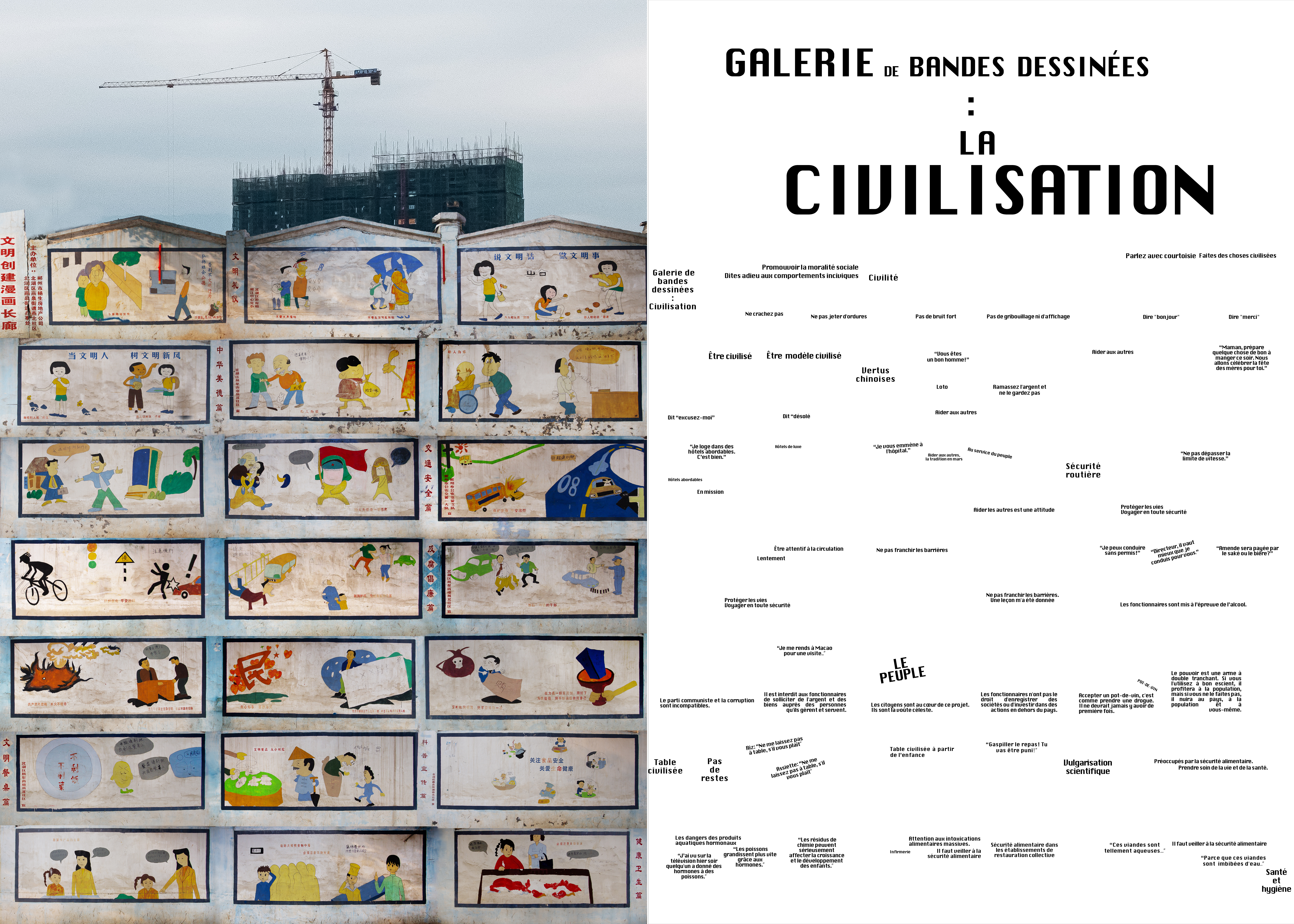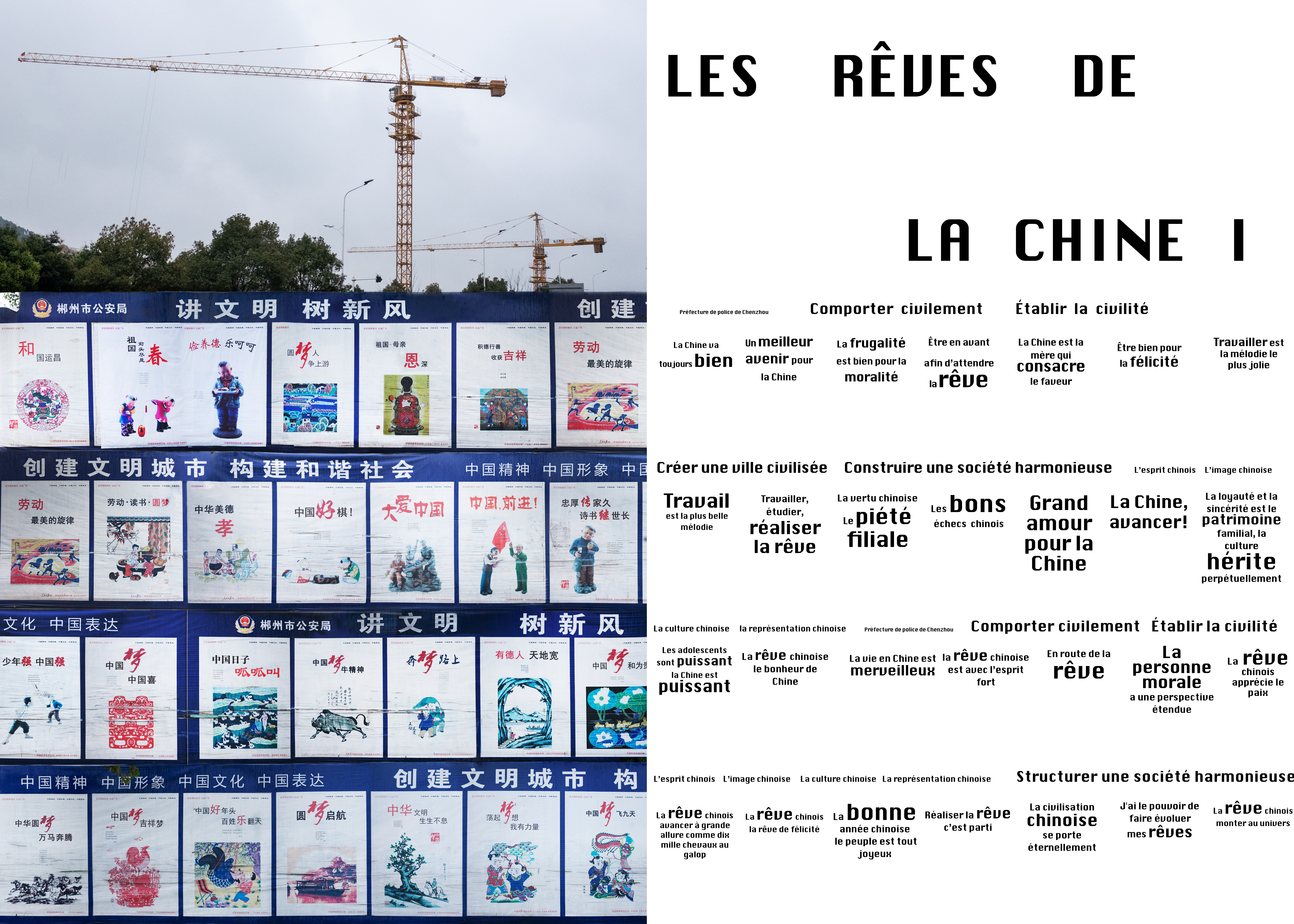 Ces lieux représentent un état de devenir, un état incertain. Les rêves communautaires se manifestent comme des spectres qui hantent dans un espace de devenir suspendu. Quand les présentations des rêves communautaires rencontrent le regard des différents habitants, c’est un moment suspendu qui fait générer à la fois la nostalgie du passé et l’imagination du futur. Lorsque chacun y projette sa propre image mentale selon la situation de son vécu, les réalités multiples se croisent à ce moment du devenir. Les rêves abstraits sont concrétisés à la fois par le texte de la traduction et le texte sur le mur affiché sur l'image. Ainsi, le texte est l'image ; l'image est le texte. Dans un monde accéléré pour le développement, où nous mèneront les réalités actuelles à l'ère de l'Anthropocène ?